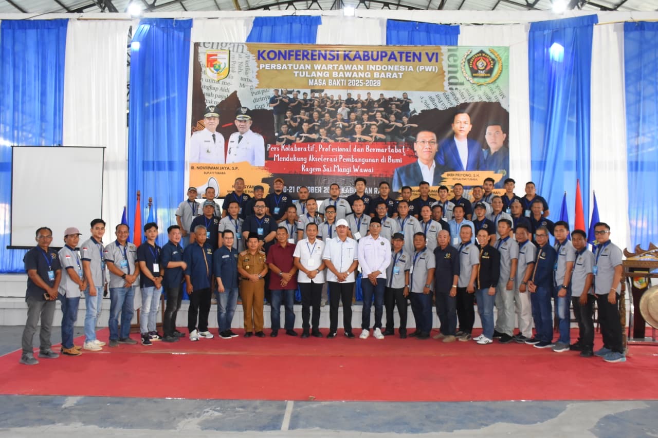 Tulang Bawang Barat– Konferensi Kabupaten (Konferkab) VI Persatuan Wartawan Indonesia (PWI) Tulang Bawang Barat (Tubaba), Provinsi Lampung, masa bakti 2025–2028 resmi digelar di GOR ZA Pagar Alam, Tiyuh (Desa) Kagungan Ratu, Kecamatan Tulang Bawang Udik (TBU).