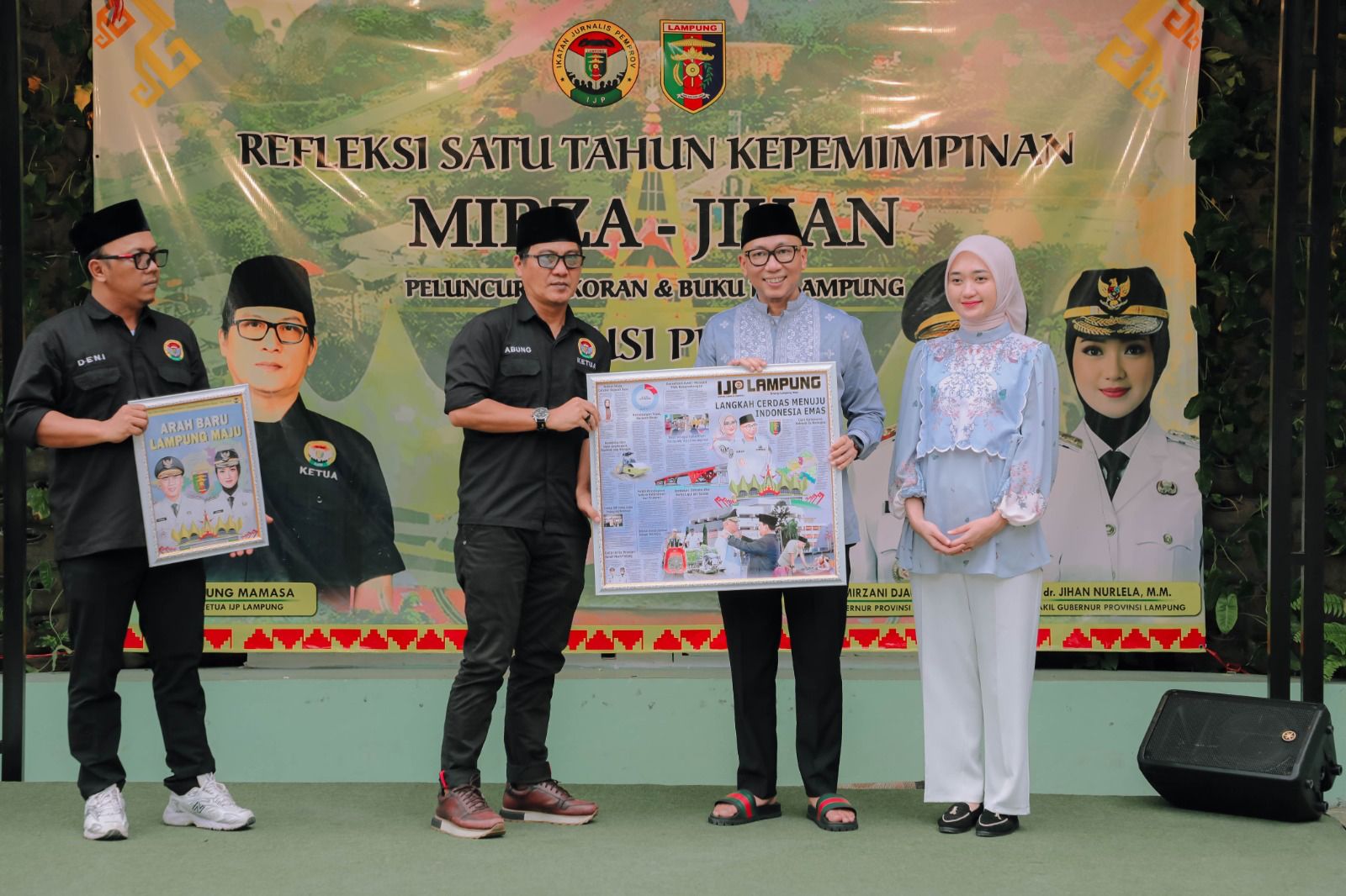 LAMPUNG – Gubernur Lampung Rahmat Mirzani Djausal bersama Wakil Gubernur Lampung Jihan Nurlela menghadiri Peluncuran Koran Ikatan Jurnalis Provinsi (IJP) Lampung dan Buku “1 Tahun Mirza–Jihan” di Taman Outdoor Gedung Pusiban, Senin (2/3/2026) sore. Kegiatan tersebut dirangkai dengan Diskusi Publik Edisi Khusus Satu Tahun Kepemimpinan Gubernur dan Wakil Gubernur Lampung.