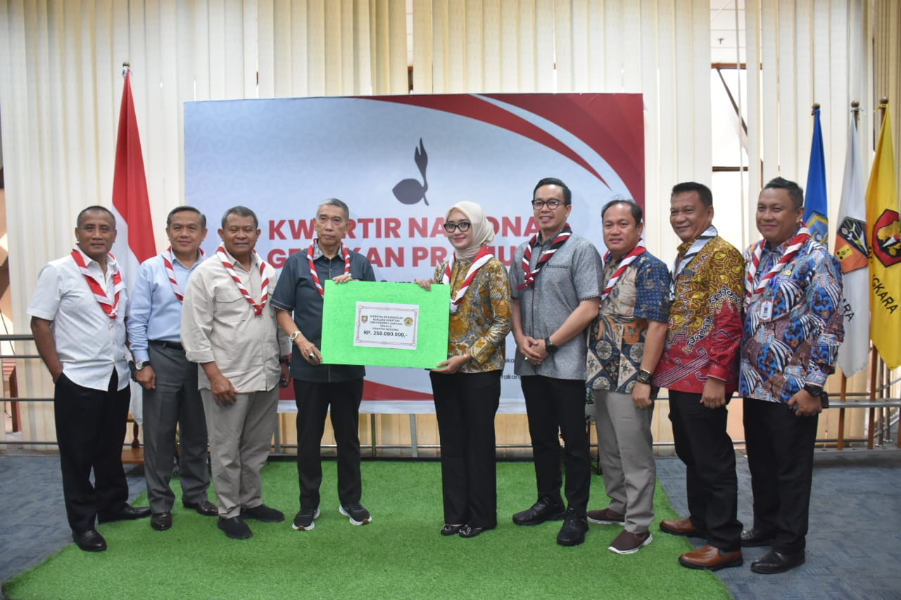 LAMPUNG – Wakil Gubernur Provinsi Lampung Jihan Nurlela, yang juga menjabat sebagai Ketua Kwartir Daerah (Kwarda) Gerakan Pramuka Lampung, menyerahkan dana Bumbung Kemanusiaan Kwarda Pramuka Lampung kepada Kwartir Nasional (Kwarnas) Gerakan Pramuka, di Kantor Kwarnas, Jakarta, Senin (19/01/2026).